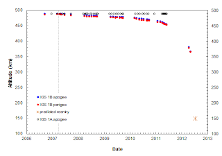 This radar satellite, launched to keep an eye on North-Korea in 2003, malfunctioned in March 2007, halfway though its mission. Since then, it has been steadily coming down (see diagrams below) in a way that